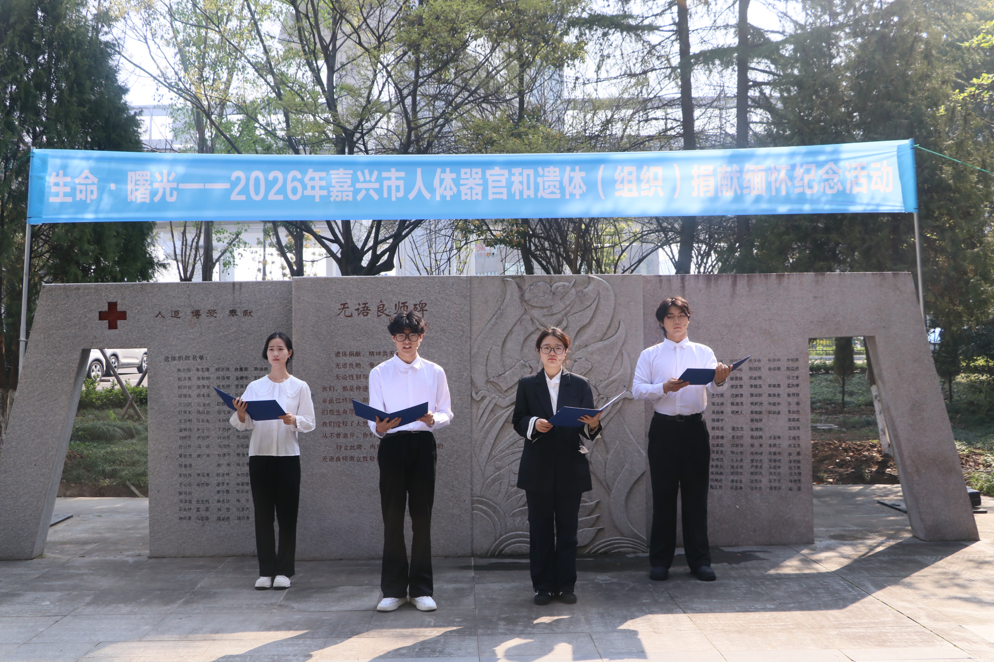 清明寄哀思,大爱永留传。为深切缅怀遗体、人体器官(组织)捐献者的无私奉献,弘扬人道、博爱、奉献的红十字精神,近日,由嘉兴大学和嘉兴市红十字会共同主办,嘉兴大学医学院承办的“生命・曙光”——嘉兴市 2026 年遗体和人体器官捐献者缅怀纪念活动在嘉兴大学无语良师纪念广场举行。嘉兴大学党委委员、副校长张琦、校党委宣传部、学工部、团委、各附属医院及嘉兴市红十字会领导和市相关单位、嘉兴大学师生、捐献者家属代表、社会各界爱心人士齐聚现场,共同致敬“无语良师”,传递生命接力的温暖力量。