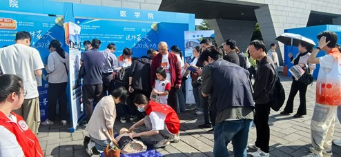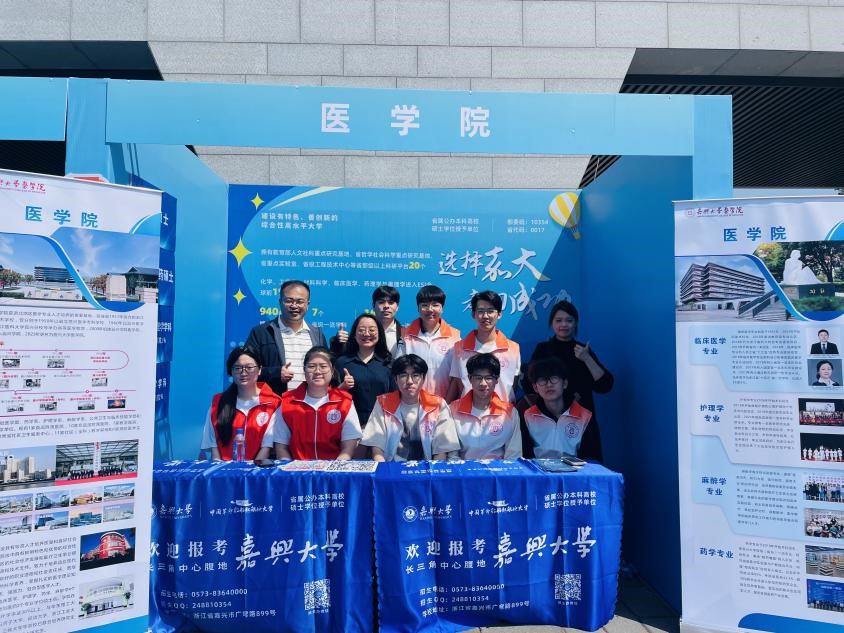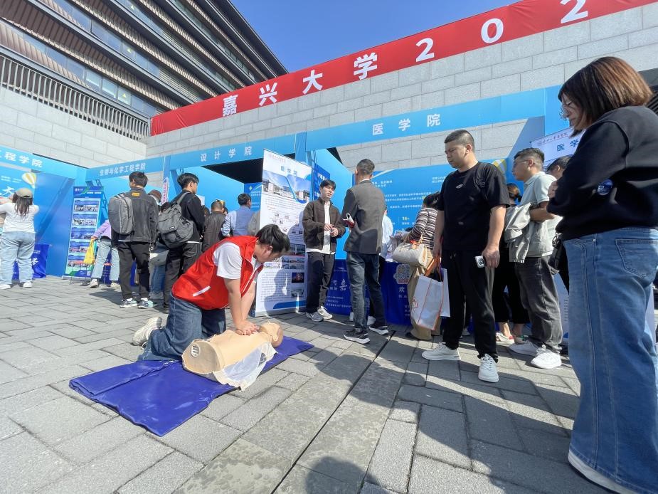 4月19日上午,嘉兴大学医学院“三位一体”招生宣传活动在梁林校区虹源湖畔火热展开。现场人流涌动,气氛热烈,尤其是精心设置的急救技能体验区,迅速成为全场焦点,吸引了大量考生与家长驻足尝试。
